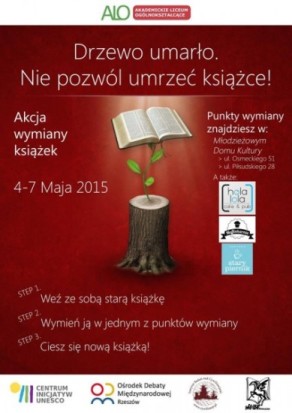 Lub inaczej, jak mówi Akademickie Liceum Ogólnokształcące w Rzeszowie „Drzewo umarło. Nie pozwól umrzeć książce!” i pod takim właśnie hasłem organizuje akcję, w ramach której od 4 do 7 maja książkomaniacy wstaną z fotela i ruszą do rzeszowskich punktów wymiany książek, aby dawać im nową duszę!