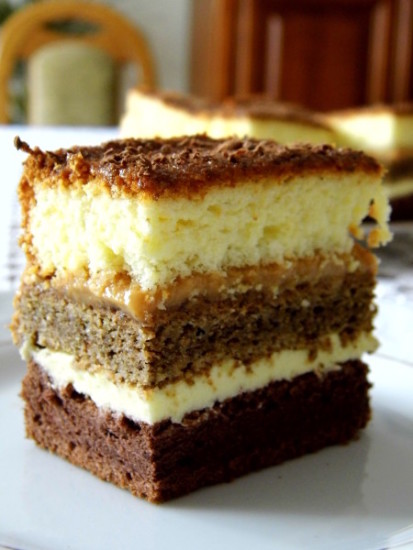 Biszkopt orzechowy: Białka ubić z cukrem na puch, dodać mąkę wymieszaną z proszkiem do pieczenia, a następnie zmielone orzechy. Piec ciasto ok. 30 min. w temp. 170 stopni. Biszkopt położyć na masę budyniową, a następnie rozsmarować 3/4 masy kajmakowej.