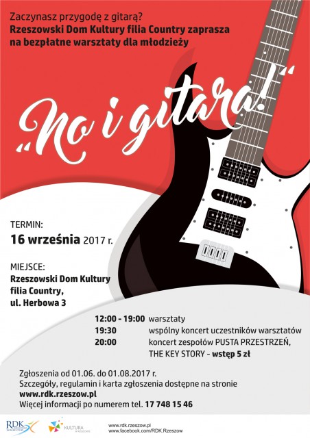 Bezpłatne warsztaty „No i gitara!”, skierowane są dla średnio zaawansowanych gitarzystów powyżej 13 roku życia. Zapisy potrwają jeszcze tylko kilka dni (do 1 sierpnia), a warsztaty rozpoczną się 16 września 2017 roku w Rzeszowskim Domu Kultury filia Country, zlokalizowanym w Rzeszowie przy ul. Herbowej 3.
