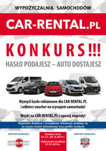 Po polubieniu na facebooku strony CAR-RENTAL.PL umieszczamy pod postem konkursowym na profilu na facebooku wymyślone przez nas hasło. Konkurs trwa do 30.12.2015r.